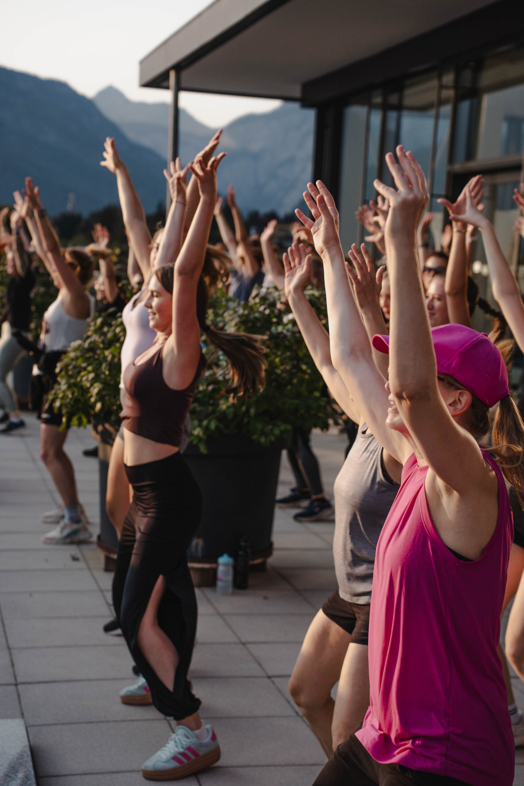 Sunset Dancefloor hoch über Saalfelden! Auf der Dachterrasse des Congress Saalfelden wurde der Sonnenuntergang zur Partybeleuchtung. Rund 100 TänzerInnen tanzten sich mit einer Salsa zu “Survivor” in den Abend.